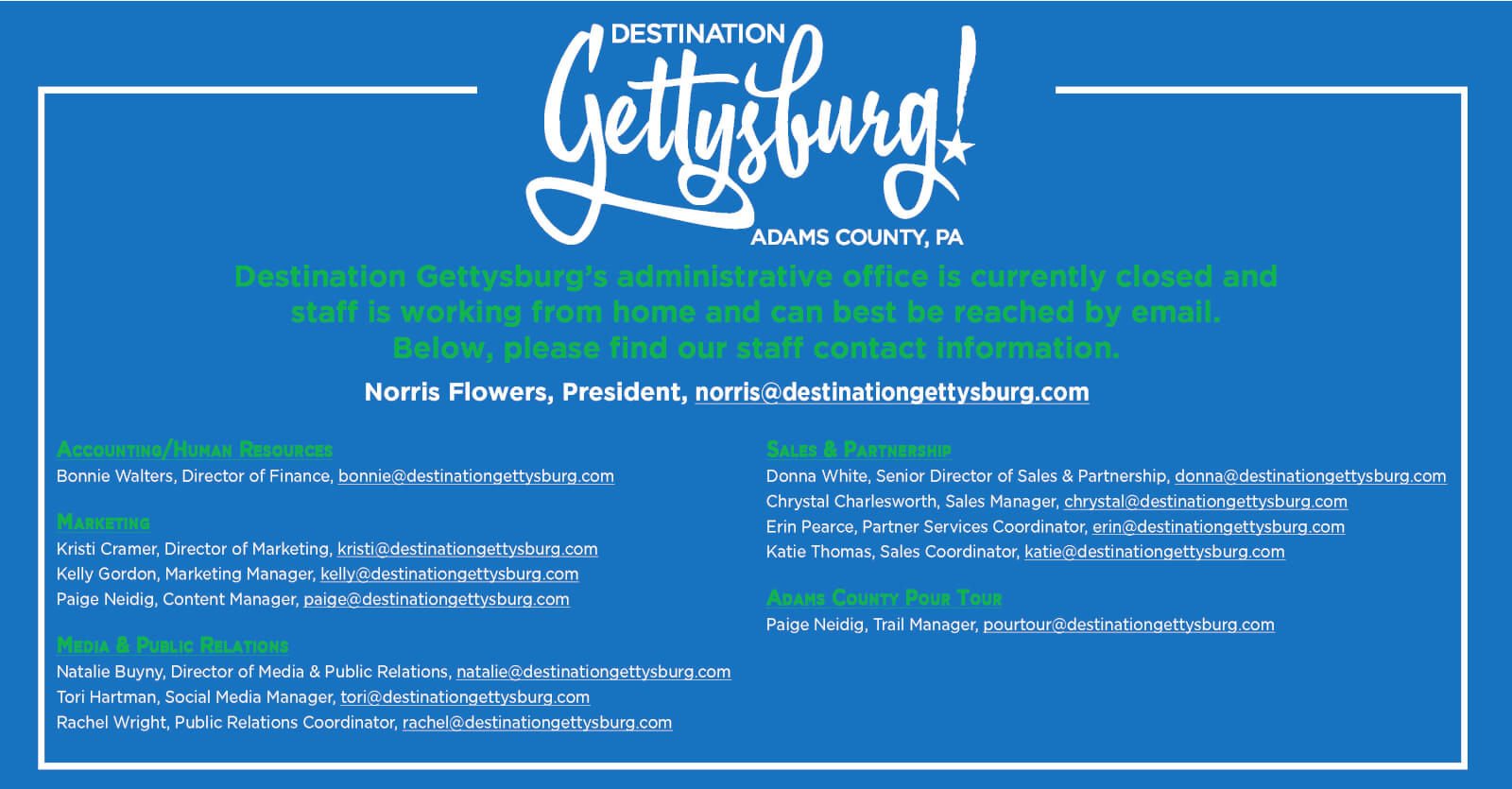 As Gettysburg experiences a staffing shortage coming out of COVID, please be patient with our businesses as many are understaffed. Remember to be respectful and kind, as they are doing all they can to make sure you have a good experience. We advise that visitors call the business ahead of arriving to confirm their hours, as they may change daily.
