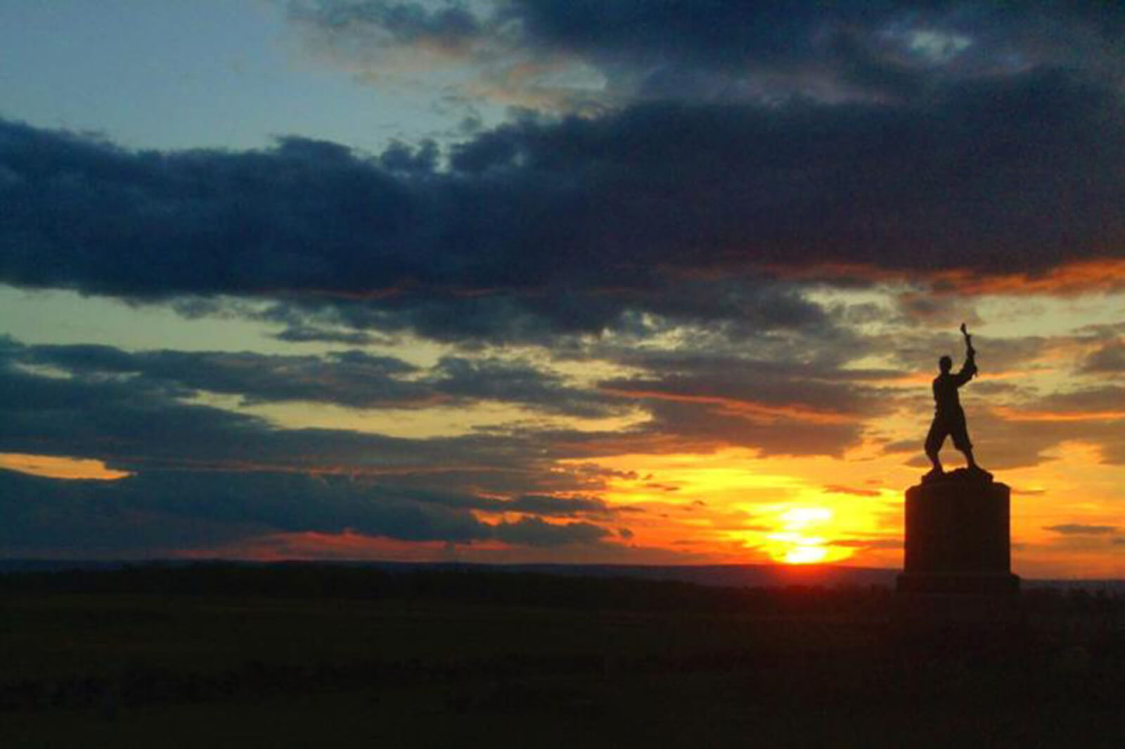 The Pennsylvania Monument, the largest monument across Gettysburg National Military Park, offers views of the battlefield and sunset like no other location here can. Standing 110 feet tall in the center of the 2nd and 3rd day’s Battlefield, all you can see are fields, monuments, the Round Tops and sky. This unobstructed view to the west highlights the South Mountains as the sun sets behind them.