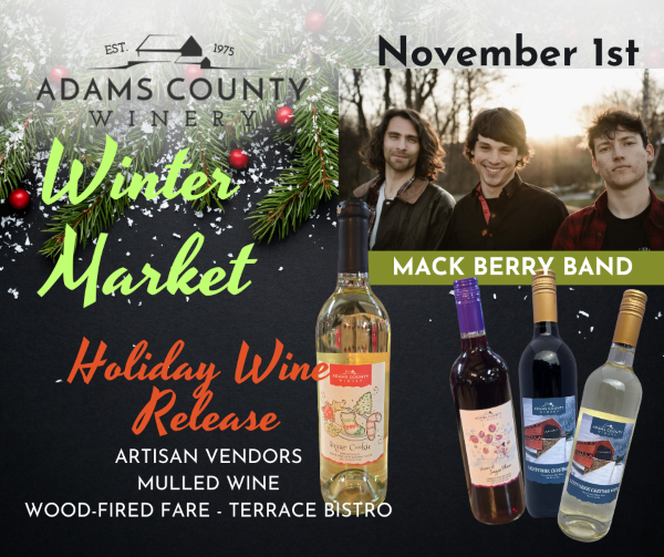 Adams County Winery invites everyone to a double dose of excitement with a Winter Market and Wine Release on November 1. Visit the covered pavilion to visit and shop with local artisans and food vendors. Get an early start to holiday shopping here at the Farm Winery.