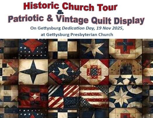 See the “America 250 Patriotic and Vintage Quilt Display” on November 19, 2025, at the Gettysburg Presbyterian Church, located at 208 Baltimore St, Gettysburg, PA. Tours begin at 9:00 AM to 4:00 PM.