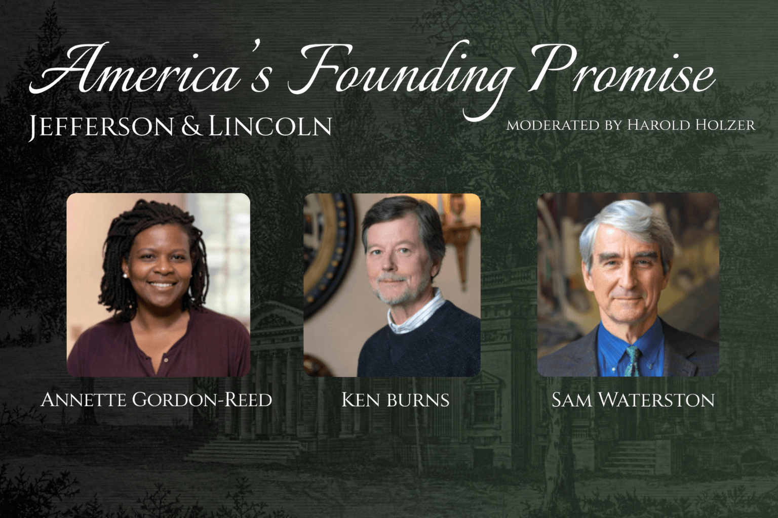 Ken Burns will be joined on stage by actor Sam Waterston, who voiced both Thomas Jefferson and Abraham Lincoln in his films, and by acclaimed author, historian, and professor Annette Gordon-Reed. The conversation will be moderated by author and Lincoln historian Harold Holzer.