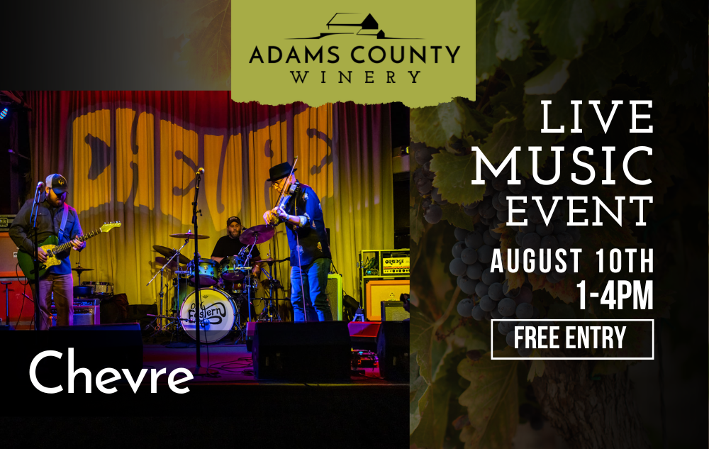 Adams County Winery is excited to welcome Chevre back again for another Live Music on the Grounds performance! Chevre will perform at the Farm Winery from 1 p.m. – 4 p.m.
