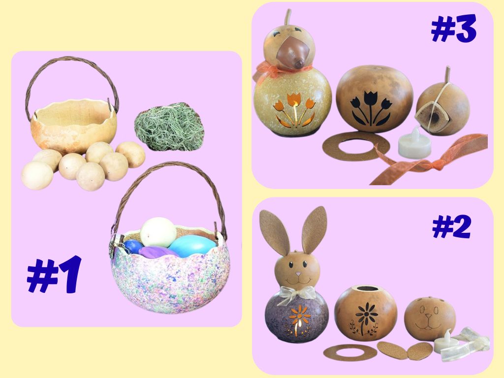 #1 Easter Basket with Seven Eggs and Grass – The box shows the basket and eggs painted and unpainted, as well as everything included with this project. Our gourd basket is approximately 8″ in diameter and our gourd eggs are approximately the same size and shape as your average chick egg.