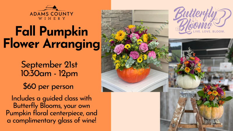 Celebrate the beauty of fall with a hands-on craft workshop led by the talented team at Butterfly Blooms – hosted right here at Adams County Winery! In this fun and creative session, you’ll learn how to design and arrange fresh, seasonal florals atop a real, uncut pumpkin, creating a stunning, natural centerpiece just in time for the cozy autumn season.