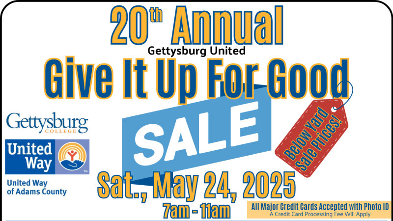 Join us in the Gettysburg College Hauser Field House for below yard sale prices at the Give It Up For Good Sale on May 24th! Large furniture, clothing, household items, school supplies, small appliances and more – all priced to move! Early bird admission runs from 7am-8am for $5/person. Free admission runs 8am-11am. Fill a provided bag with clothes and linens for $25/bag from 7am-10am. From 10am-11am, remaining merchandise is half priced. Park in the stadium lot. Email Lmcmahon@uwadams.org with questions. This event benefits the United Way of Adams County Community Impact Fund.