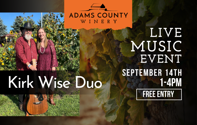 Adams County Winery is excited to welcome back Kirk Wise for a Live Music on the Grounds performance. Kirk will perform at the Farm Winery from 1 p.m. – 4 p.m.