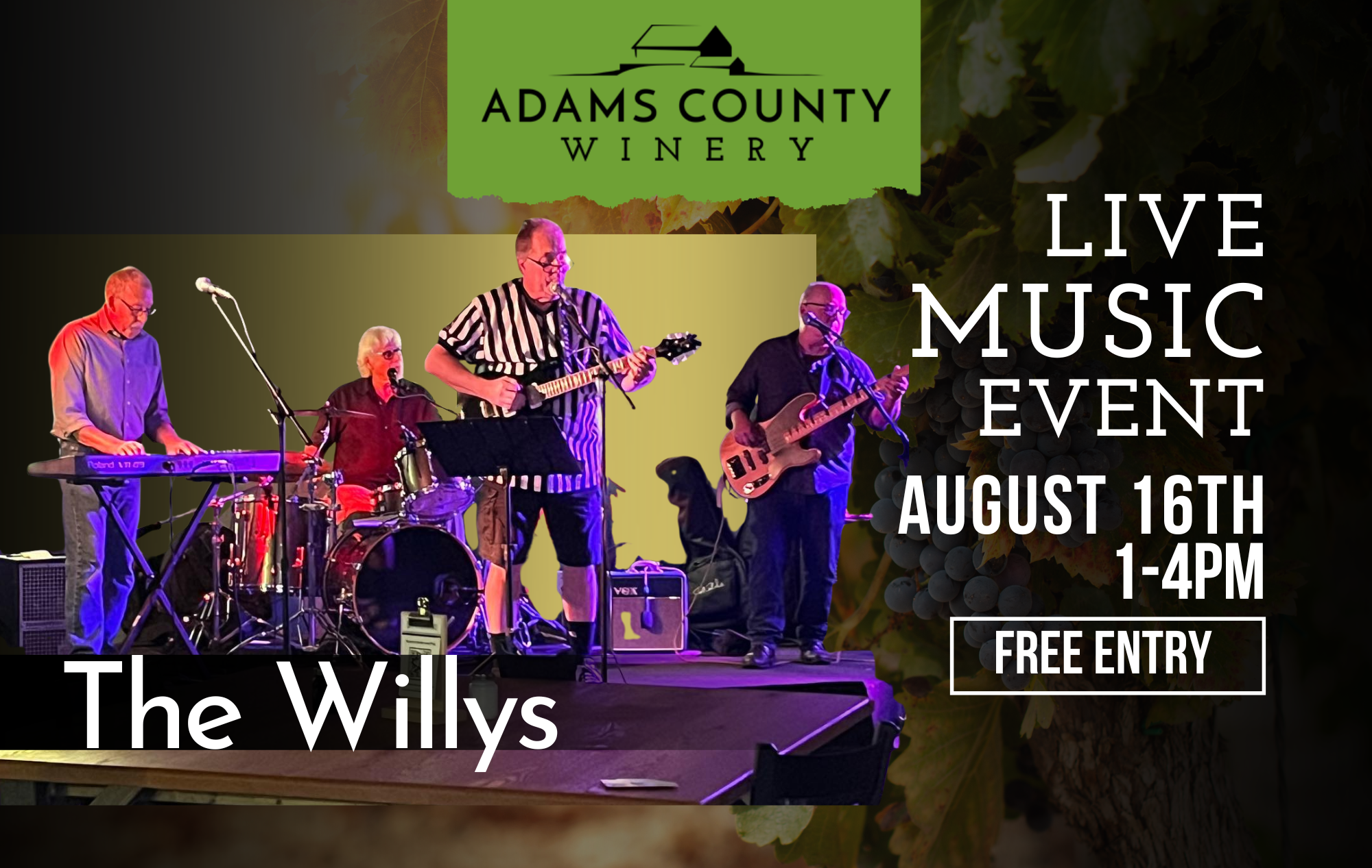 Adams County Winery is excited to welcome The Willys back for a Live Music on the Grounds performance! They will perform at the Farm Winery from 1 p.m. – 4 p.m.