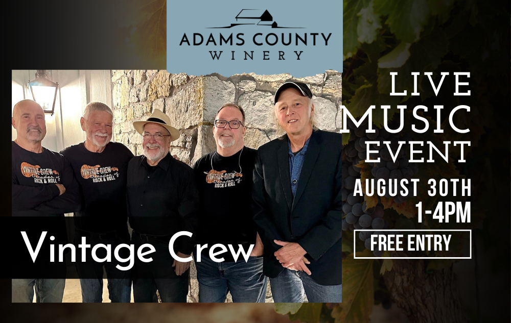 It’s Labor Day weekend and Adams County Winery is excited to welcome back Vintage Crew for another Live Music on the Grounds performance! They will perform at the Farm Winery from 1 p.m. – 4 p.m.